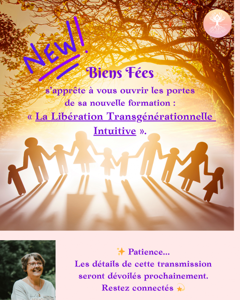 En préparation chez Biens Fées : Je travaille actuellement à la création d’une formation en Libération Transgénérationnelle Intuitive. Cette formation est conçue comme un cadre structuré, alliant écoute, conscience et outils pratiques, afin de vous permettre un accompagnement plus profond de vos patients et de soutenir leur cheminement vers un mieux-être durable. Le temps de conception est volontaire : il me permet de construire un contenu solide, respectueux des parcours individuels et réellement transformateur. Sa présentation aura lieu prochainement. Au plaisir de vous en dire davantage très bientôt.